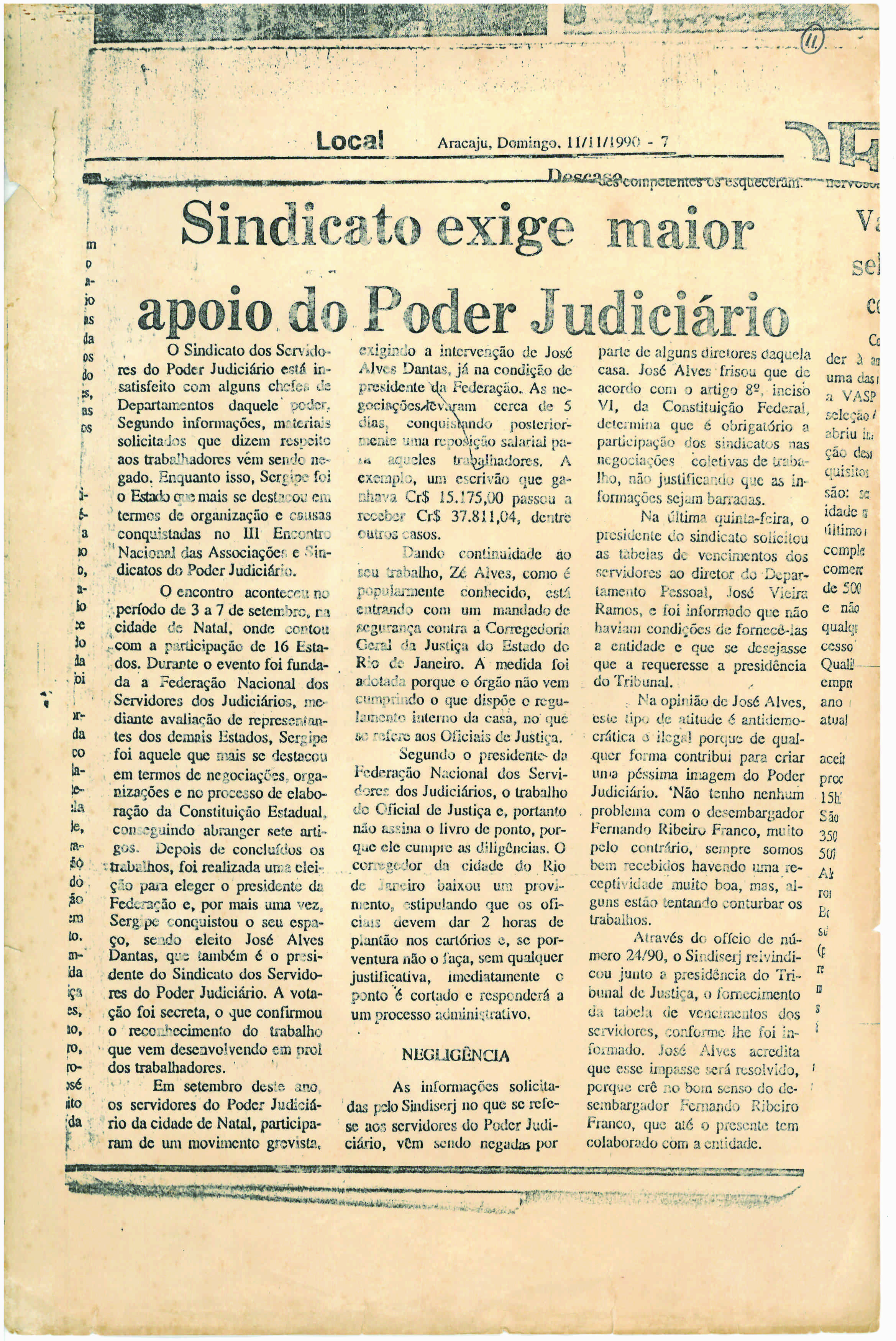 Nesse período, o sindicato sergipano recém-criado assume a Presidência da Federação Nacional dos Servidores do Judiciário nos Estados, a Fenajud. A Presidência da federação foi exercida pelo Oficial de Justiça do TJSE, José Alves Dantas.