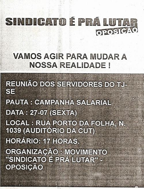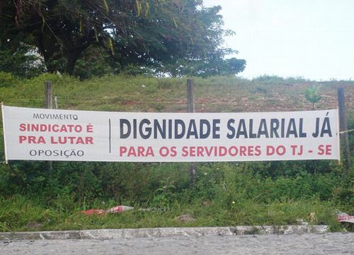 Com o tema “Dignidade Salarial Já!”, pela primeira vez na história o Tribunal de justiça de Sergipe, os trabalhadores foram às ruas, distribuíram panfletos e penduraram faixas que denunciavam a pior política remuneratória do Judiciário brasileiro. Todas as ações foram financiadas com o apoio de outros sindicatos CUTistas e com os escassos recursos dos próprios servidores.
