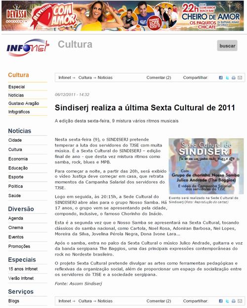 O intenso 2011, ano de muitas mudanças e que representou mais um divisor de águas na história da organização dos servidores do TJSE, encerra com mais uma edição do projeto Sexta Cultural, que combinou a comemoração pela vitória conquistada na campanha salarial e a confraternização de final de ano dos servidores do Judiciário sergipano.