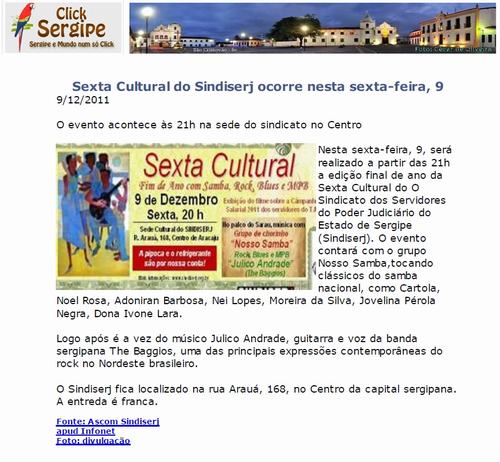 Também no final de abril, o sindicato inaugura o primeiro projeto cultural da sua história, de caráter permanente, o “Cine Sindiserj”, que a partir da segunda edição logo passou a ser batizado como “Sexta Cultural”, combinando cinema, músicas e exposições. O projeto teve objetivo definido, cumprir a previsão estatutária da formação de espaço de integração entre sindicalizados, familiares, amigos e trabalhadores de outras categorias, combinando atividades lúdicas com a formação política da categoria. Inicialmente o projeto foi programado para ocorrer mensalmente, mas nas primeiras edições a periodicidade foi alterada para cada dois meses.