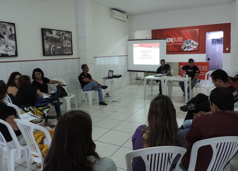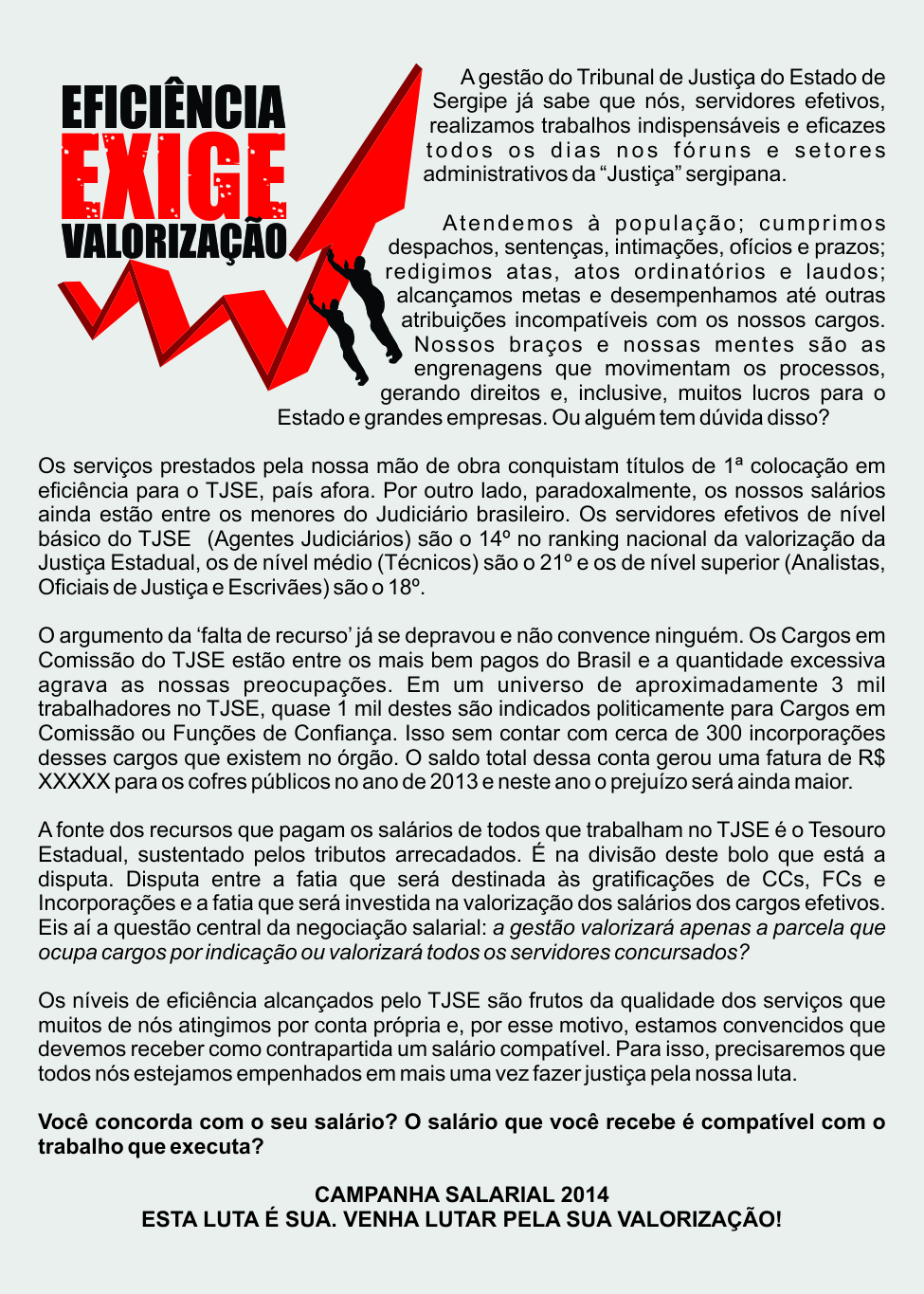 Sem avanços nas tentativas de abertura de diálogos com a Presidência do TJSE, que continuava se esquivando das discussões, comandada pelo Des. Cláudio Déda, em julho, a categoria aprovou em Assembleia Geral a deflagração da campanha salarial de 2014, com o mote que acompanhou os debates a respeito do nível das atribuições travados no primeiro semestre: “Eficiência exige Valorização!”. A partir da decisão, iniciam Plenárias em várias regiões do estado para discutir na base as reivindicações que viriam a compor a pauta da campanha salarial desse ano.