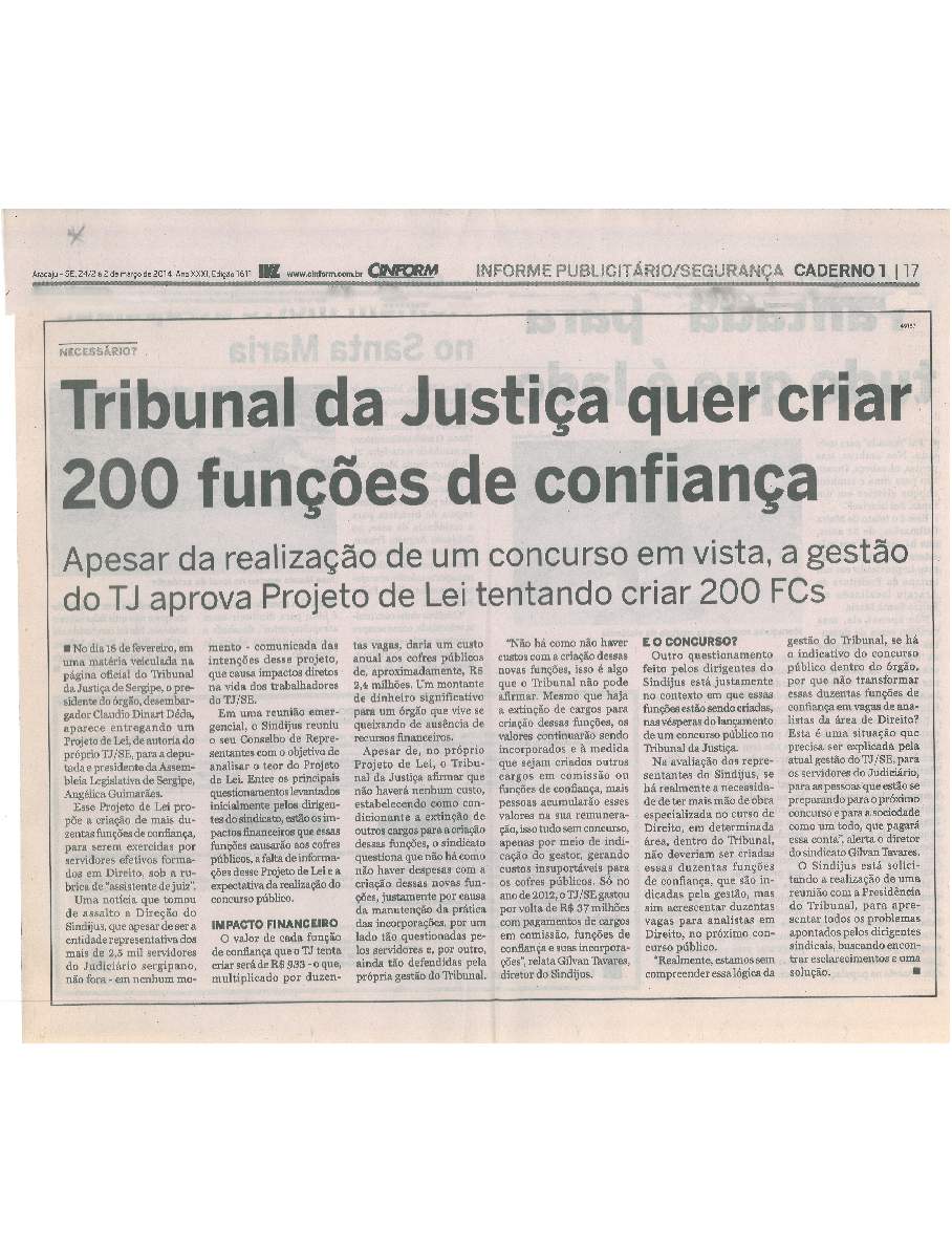 Logo após às eleições, o sindicato provoca uma ampla discussão pública em combate à criação de 200 funções de confiança de Assistentes de Juiz no TJSE. A partir da atuação do Sindijus, o debate sobre a criação das FCs ganha corpo, repercute com destaque na imprensa e o debate chega a ser pautado até a Assembleia Legislativa do Estado de Sergipe (Alese).