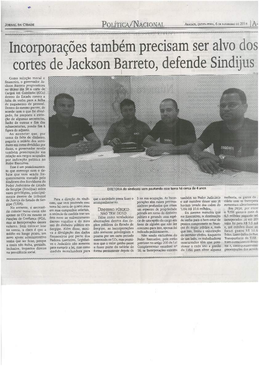 Logo depois, o Governador Jackson Barreto anuncia uma Reforma Administrativa que deixa todos os servidores estaduais em estado de alerta, por ameaçar a retirada de direitos como o Adicional do Terço pago aos 25 anos de serviço. Mobilizações e atos públicos organizados pelas centrais sindicais na Assembleia Legislativa passam a ser constantes. E o Sindijus é uma das entidades ativas nesse processo de resistência. O Sindijus assume, em conjunto com o Sindicato do Fisco (Sindfisco), a comunicação do fórum de entidades sindicais que se uniram para lutar contra a corte de direitos.