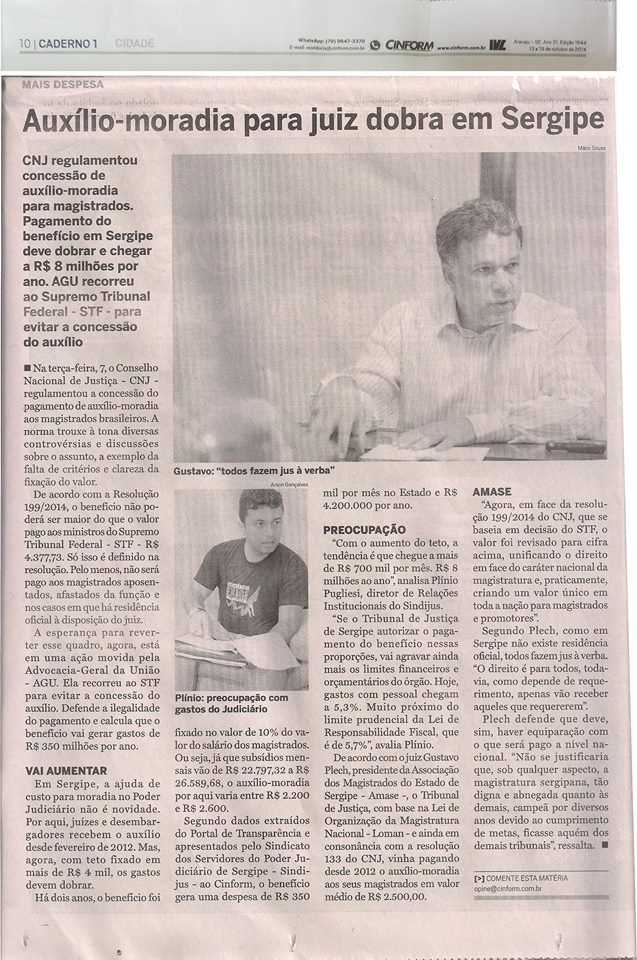 Em outubro, a primeira reunião para tratar da pauta de reivindicações da Campanha Salarial acontece sem a presença do Presidente do TJSE e não avança, pois os representantes da gestão alegam falta de recursos para valorizar os servidores. Enquanto continua alegando falta de recursos para atender a pauta dos servidores, os desembargadores aprovam o aumento do Auxílio-Moradia dos magistrados em Sergipe para o valor de R$ 4.377,75. O valor representava quase o dobro do Vencimento Base dos Técnicos Judiciários e ainda era maior que o salário dos Analistas. O caso tem repercussão na imprensa e a sociedade assiste indignada o crescimento de privilégios para um setor elitizado no Judiciário.