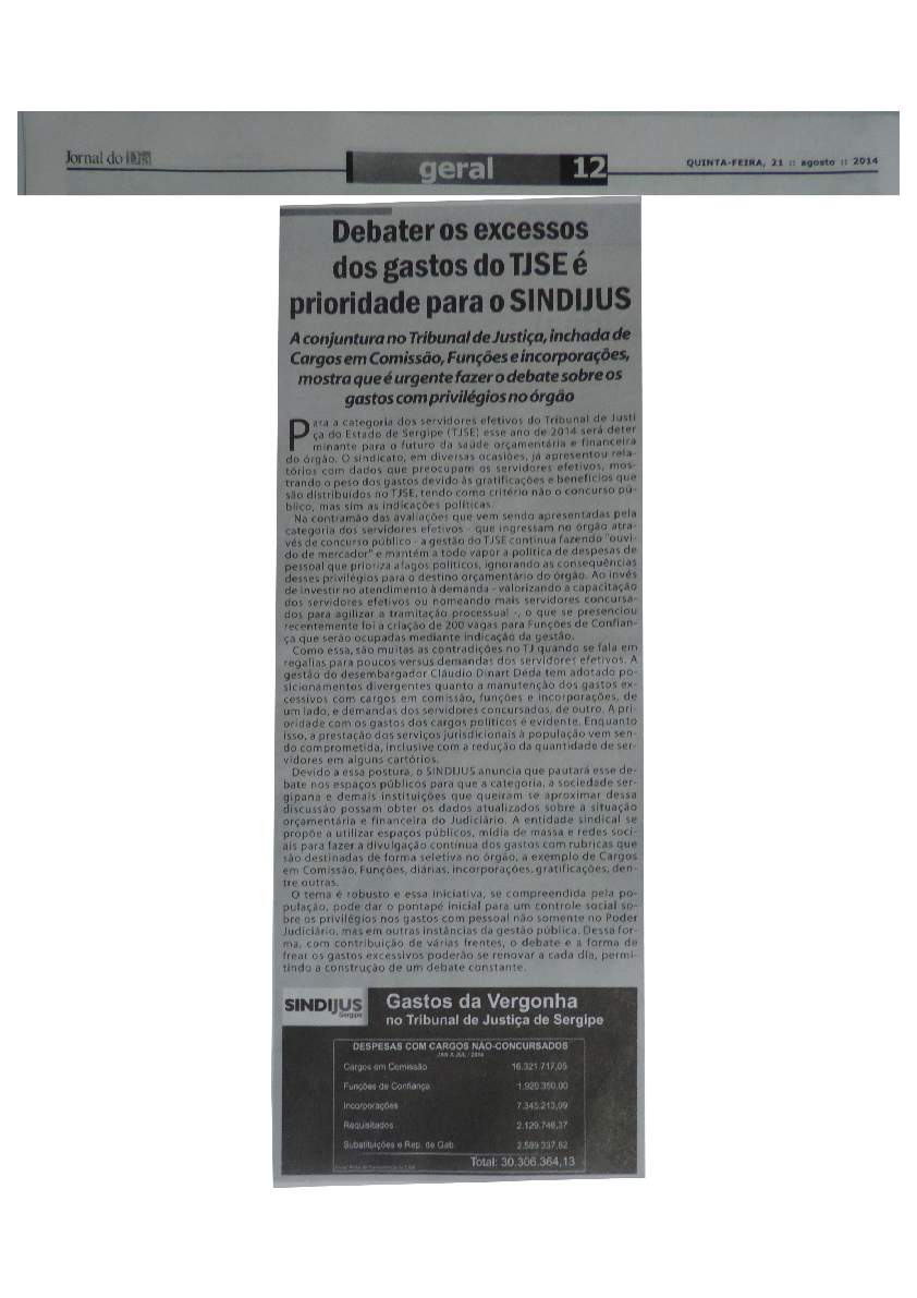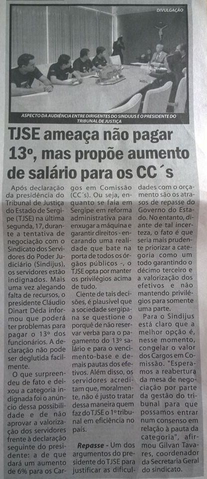 No meio do ano, o sindicato continua fazendo fortes questionamentos públicos, principalmente através da imprensa, sobre os gastos com pessoal no TJSE, principalmente combatendo os altos salários e as incorporações de CCs e FCs. Mas a gestão do tribunal não abre espaço para dialogar sobre o assunto.